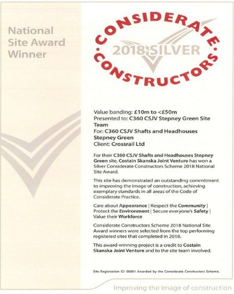 Kilnbridge are thrilled to announce that the sites for the Crossrail Stepney Green and Fisher Street projects we are currently working on have won a Silver Award in this year’s Considerate Constructors National Site Awards.