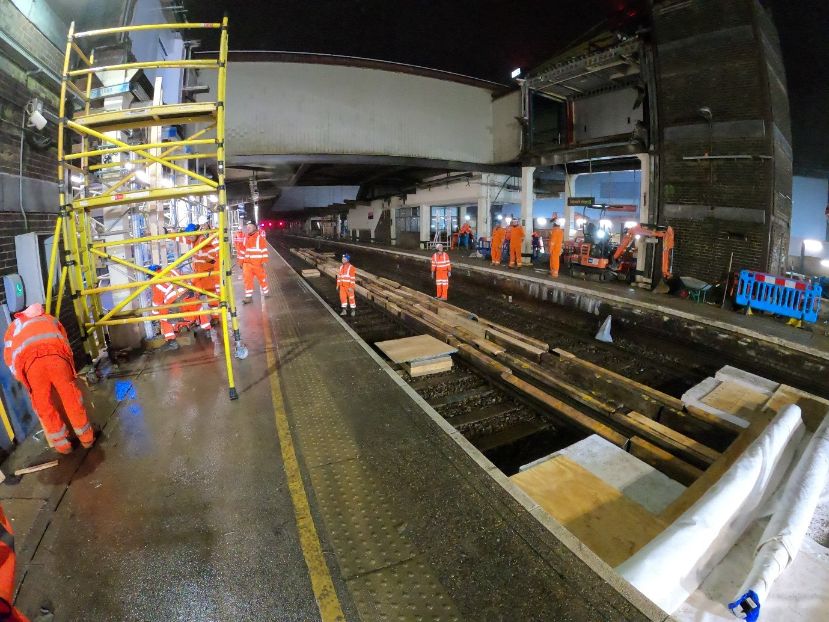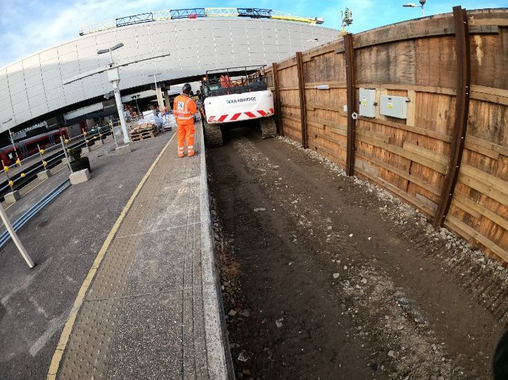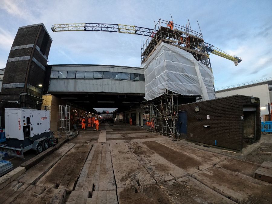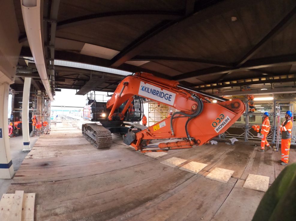 On the first-weekend possession, platform 4 and 5 tracks were securely covered with polystyrene and timber to provide a suitable working platform for the demolition plant and equipment. The southern overbridge, platform 5/6 lift shaft structure and plant room can be seen in this image.