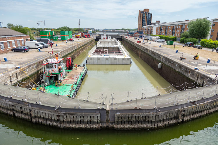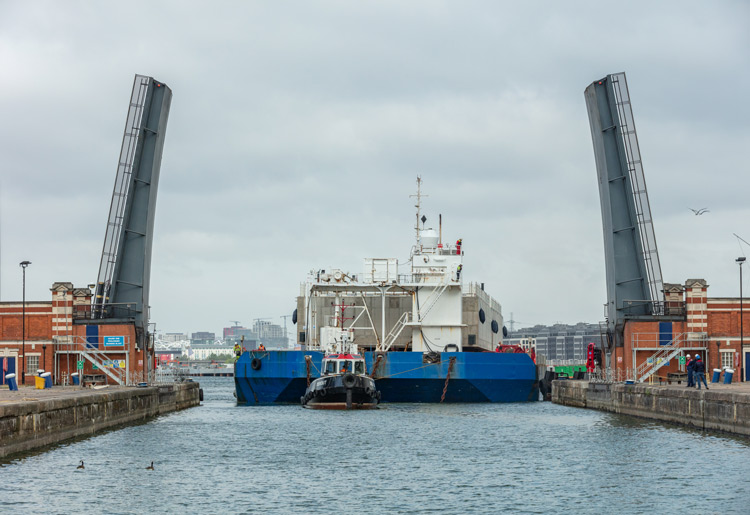 The barge was then towed from the site dockside into the KGV lock. The water level in the lock was lowered until the stern of the barge sat on the silt at the bottom of the lock. Once stable, the water level was raised at the same time as the barge buoyancy tanks being flooded such that the barge remained seated on the dock bed as the depth of water in the lock increased.