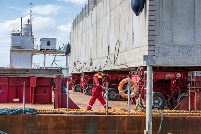 Linkspan bridges and wedges were lifted into position at the dockside, so as to create a bridge from the barge to the SPMT concrete strip. Once in place, the SPMTs slowly drove onto the barge loaded with the hull. As the combined weight of the SPMTs and hull transferred onto the barge, the complex buoyancy of the barge was adjusted to compensate for the load transfer. Once in the position, the hull was lowered onto the steel stools welded onto the barge deck and the SPMTs were driven back off the barge. This was then repeated with the second hull.