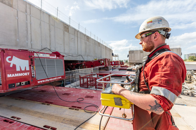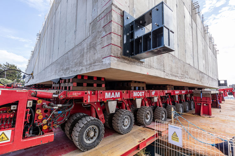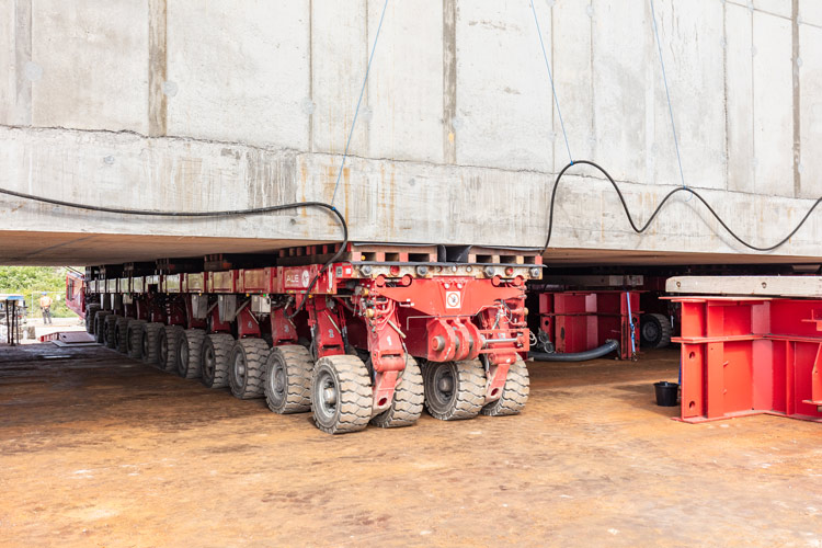 As the barge was being prepared, the team brought in SPMT (self-propelled modular transporter) units, and a total of four 12-axle SPMT units were assembled on site. The SPMTs were driven under the first hull on pre-prepared level concrete strips. Subcontractor Mammoet undertook the complex mobilisation with a team of six.