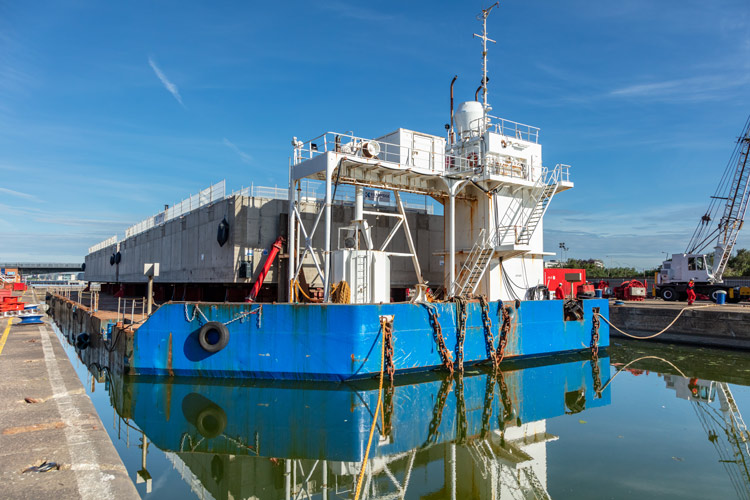 The first hull was then jacked up clear of the supporting formwork and reversed backwards away from the dockside. Meanwhile, the barge was towed from the KGV Lock to site and moored immediately adjacent to the two hulls – ready for loading.