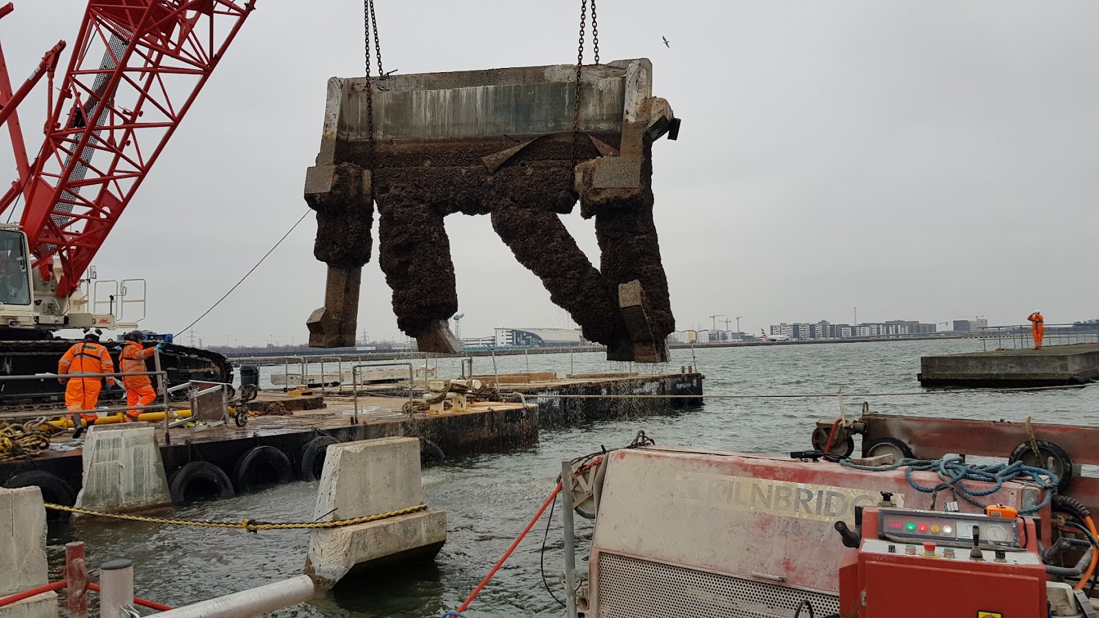 Kilnbridge were appointed as a specialist subcontractor by Topbond PLC to carry out demolition works on Dolphin 7 at London City Airport. The jetty was 156m long and 6m wide and the structure stood 1m above the water line and 6m below it. Kilnbridge were responsible for removing the concrete structure to 4m below the water line.