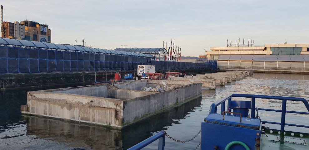 The wire sawing team separated the jetty’s concrete frame structure into 52 single sections prior to the main underwater operation. All sections were cut at 4m below the water line, lifted out onto the transport barge and transported to shore through the King George V dock to the laydown and processing area.