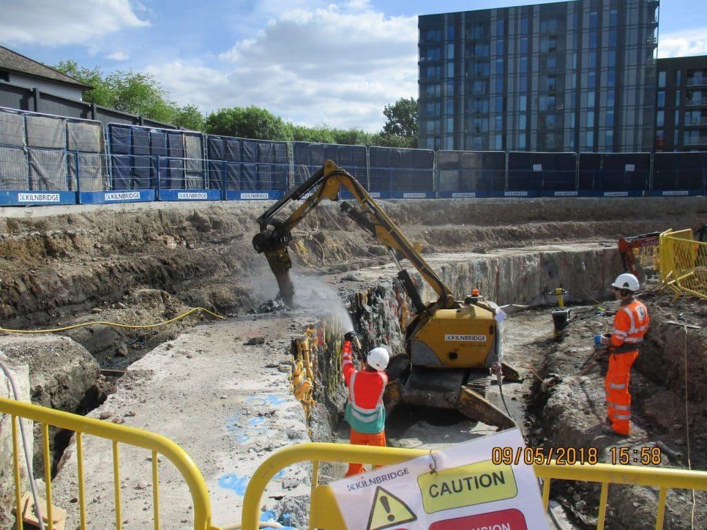 Kilnbridge were appointed as a specialist subcontractor in the delivery of the new Thames Tideway scheme located at the tunnel drive shaft site in Bermondsey. The scope of works entailed undertaking the initial shaft excavation to -6m AOD within strict archaeological constraints. The works also included the demolition of the D-walls which were deconstructed whilst adhering to strict noise, vibration and dust constraints due the proximity of local residents.
