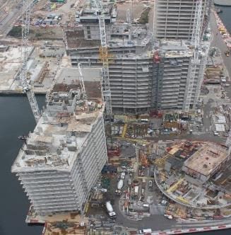 The scope of works was the construction of the common basement at 10 Park Drive and the overlying superstructures for A2 and A3. This included secondary steel work with an overall reinforced concrete footprint of 65,000m². Building A2 comprised 14 floors and building A3 comprised 43 floors of reinforced concrete frame.